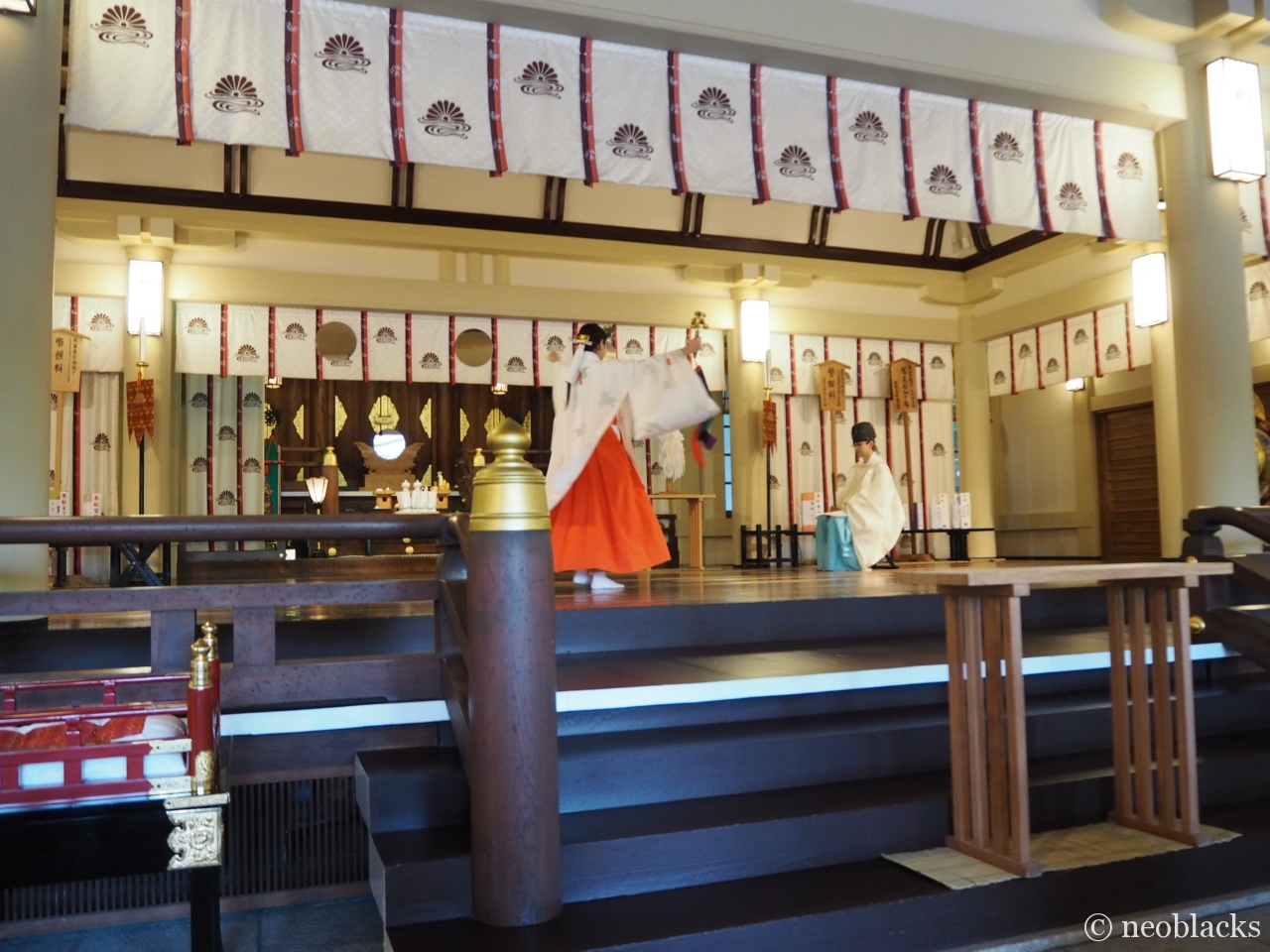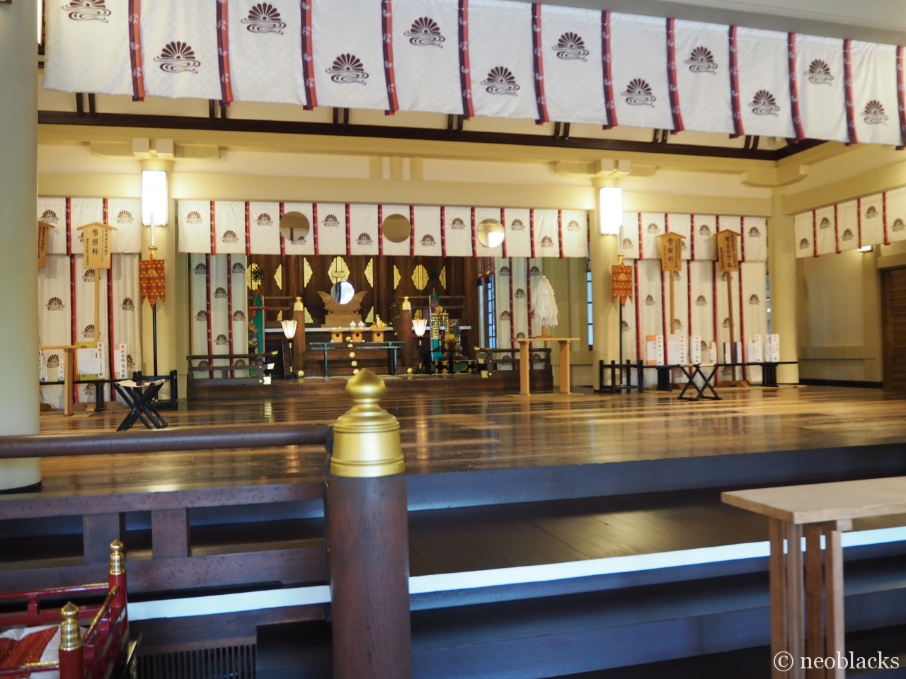 拝殿には専用の一般入場出来ない左側の通路を通って入ります。車椅子では通れず、頑張ってしきたり通り神職の方付き添いで歩きながら拝殿の席に到着しました。