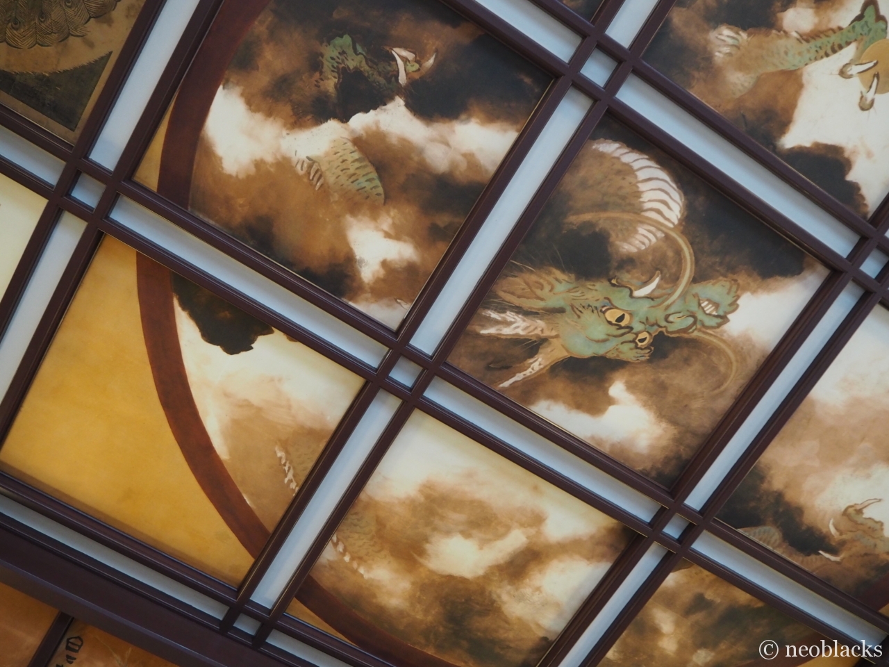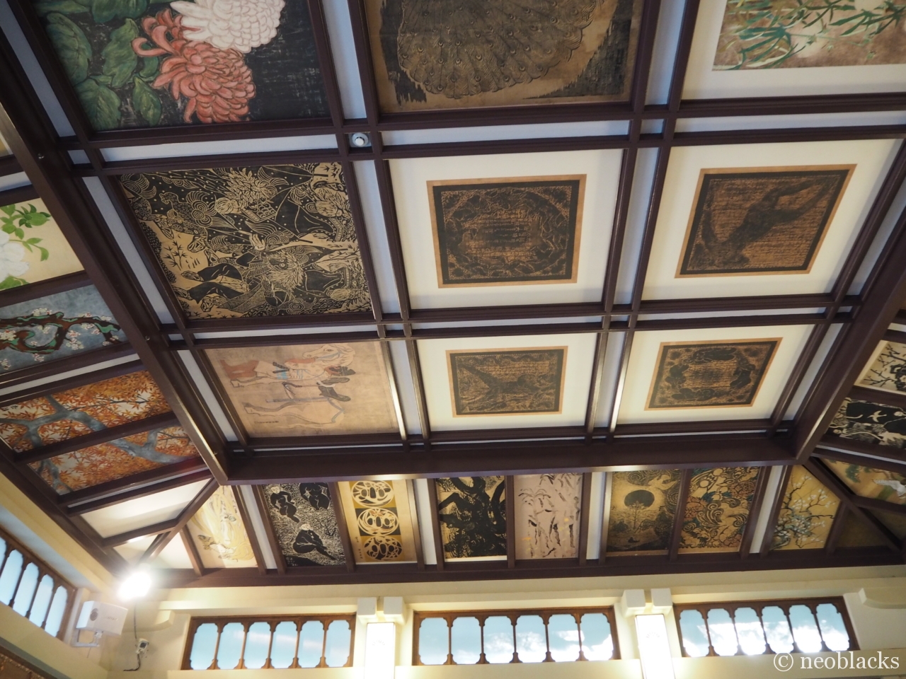 現在の社殿は戦後に再建されたもので、天井には棟方志功の呼びかけで集まったという、著名画家の奉納画163点が埋め尽くされるように並んでいます。この壮大な天井絵の数々はまさに一見の価値ありです。ちなみに中央円形の「青竜」は、岡倉天心に学んだ南画の巨匠と呼ばれる福田眉仙の作だそうです。